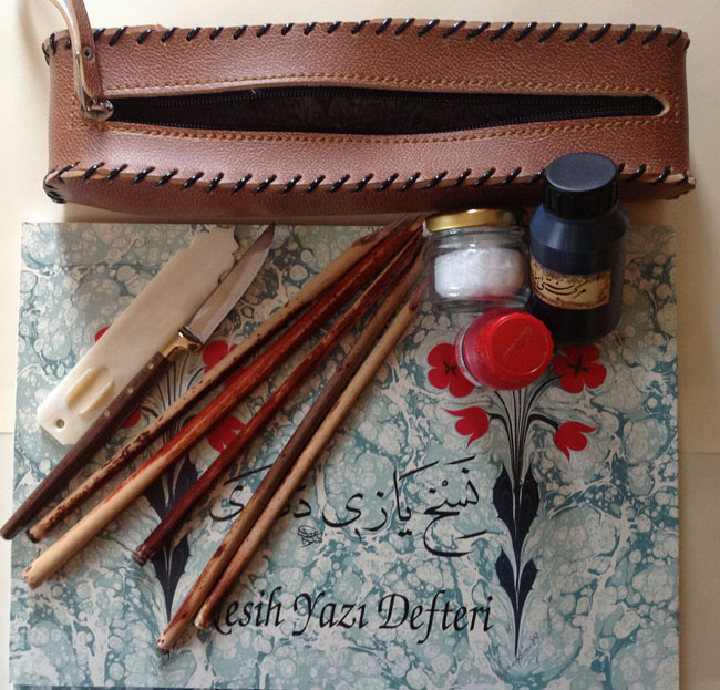 Turkish calligraphists have always made the paper, pens and ink they used. The paper used to be painted with natural dyes. Then it was polished with boiled starch and egg white. The paper dressed in this way allowed for easily correcting mistakes. Pens were made of hard reeds. Bigger pens (known as “celi”) were made of wood. To produce ink, the calligraphists used to burn materials such as pine and linseed oils.